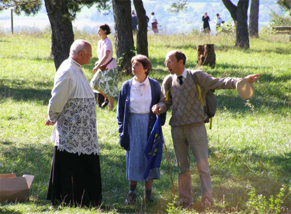 tandis que l’abbé Rousseau dirige la foule de pèlerins.