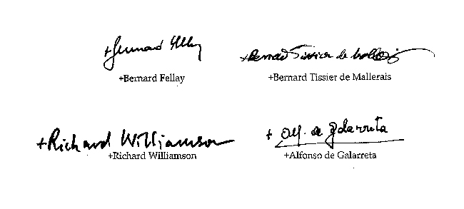 A Sa Sainteté le pape Benoît XVI Très Saint-Père, C’est dans l’action de grâces que nous désirons exprimer à Votre Sainteté notre profonde reconnaissance pour l’acte de Sa paternelle bonté et de Son courage apostolique par lequel Elle a rendu inopérante la mesure qui nous a frappés il y a vingt ans à la suite de notre sacre épiscopal. Son décret du 21 janvier 2009 réhabilite de quelque façon le vénéré fondateur de notre Fraternité sacerdotale, S. Exc. Monseigneur Marcel Lefebvre. Il procure aussi un grand bien à l’Église, nous semble-t-il, en faisant justice aux prêtres et aux fidèles du monde entier qui, attachés à la Tradition de l’Église, ne seront plus injustement stigmatisés pour avoir maintenu la foi de leurs pères. C’est en raison de ce combat de la foi que nous assurons votre Sainteté, comme Elle le souhaite, de « n’épargner aucun effort pour approfondir dans de nécessaires entretiens avec l’Autorité du Saint-Siège les questions encore ouvertes ». Nous désirons en effet commencer dès que possible avec les représentants de Votre Sainteté des échanges concernant des doctrines en opposition avec le Magistère de toujours. Par ce chemin encore nécessaire qu’évoque Votre Sainteté, nous espérons aider le Saint-Siège à porter le remède approprié à la perte de la foi à l’intérieur de l’Église. La Vierge Marie Immaculée a visiblement guidé les pas de Votre Sainteté à notre rencontre, elle Lui maintiendra sa gracieuse intercession. C’est avec cette assurance que nous demandons filialement au Pasteur universel de bénir quatre de ses fils les plus attachés au Successeur de Pierre et à sa charge de paître les agneaux et les brebis du Seigneur. Menzingen, le 29 janvier 2009, +Bernard Fellay |