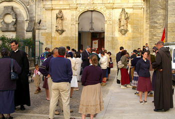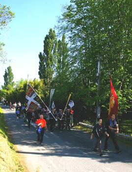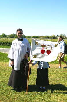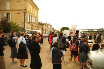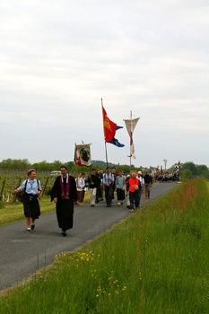 Nous sommes à présent une centaine à marcher, bien entourés par les prêtres toujours à notre disposition. Comme chaque année le déjeuner se déroule au pied de château de la Benauge dans ses murs protecteurs. Beaucoup de pèlerins nous y rejoignent ainsi que le Père François Frakowiak. Et nous ne sommes plus deux, mais trois chapitres au moment du départ, les enfants ouvrant la marche. Il faut marcher vite car nous avons pris du retard, et chacun offre ses crampes, ses ampoules, sa fatigue à Notre Dame de Verdelais, pour faire une bonne Consécration.