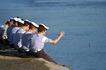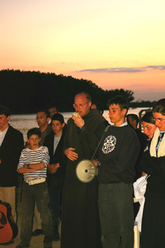 Une soupe bien chaude et réconfortante nos réunie le soir, complétée par les divers plats apportés par chacun et généreusement partagés. La soirée est estivale, idéale pour la veillée. Si Verdelais nous était conté.. que nous ont préparé conjointement les Cadets et le MJCF. Les jeux, les histoires, les chants, tout est réuni pour un moment inoubliable, et la Providence rajoute le passage d’un bateau qui est le clou de la veillée. Nous terminons la soirée avec l’Ave de Verdelais et la prière du soir guidée par notre Père bénédictin.
