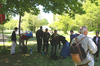 A la sortie de la messe, tout le monde se retrouve pour un grand pique-nique, riant et convivial. Malgré les désirs de sieste au bord de l’étang, il nous faut bientôt repartir, car la route est longue et vallonnée jusqu’au bivouac de Langoiran.