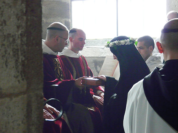 La consécration des vierges remonte aux temps antiques du IVe siècle. D’abord pour toute religieuse dans le monde, la cérémonie fut ensuite réservée aux soeurs cloîtrées, mais finit par être abandonnée auXII° siècle, au temps de sainte Gertrude, sauf chez les cisterciennes et les chartreuses. Dom Guéranger devait restaurer cette consécration au xixe siècle, l’unissant à l’émission des vœux perpétuels. Cette longue cérémonie, chantée de bout en bout, rassemble des textes de la tradition chrétienne et monastique la plus vénérable : la remarquable préface consécratoire, composée par saint Léon le Grand pour la consécration de sa propre soeur, en est le sommet, mais aussi une dizaine d’antiennes tirées de l’office de sainte Agnès, leur modèle, avec le célèbre Veni, sponsa Christi. Les religieuses étant assimilées à des diacres, la consécration se place au cœur de la messe entre le graduel et l’alléluia. Les vierges s’avancent, cierge en main – les vierges sages de l’Évangile – et se prosternent durant les litanies des saints. Elles sont consacrées par la préface puis reçoivent les insignes, voile, coule, anneau, couronne de fleurs et enfin le bréviaire car, comme les diacres, elles sont appelées à chanter les louanges divines pour l’Église ex officio.
