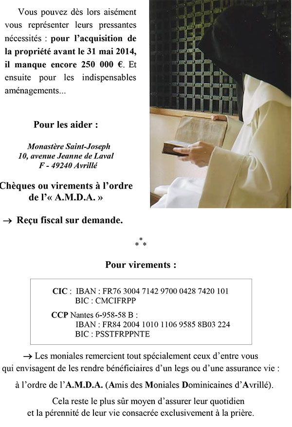 Tout don, même le plus minime est attendu avec espoir et reconnaissance : 10, 20, 30 € ou plus : qui ne le peut ? Nous serons alors les premiers à bénéficier des grâces obtenues par ces religieuses qui ont conscaré leur vie entière à la prière et au sacrifice.