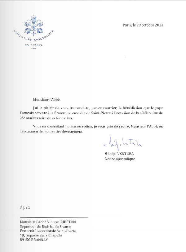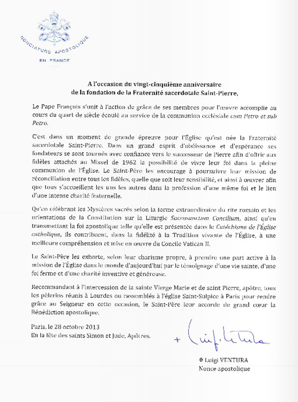 Dans un courrier adressé à l’Abbé Vincent Ribeton, supérieur du district de France, par Luigi Ventura, nonce apostolique en France le pape François estime qu’ « en célébrant les mystères sacrés selon la forme extraordinaire du rite romain (…), [les membres de la Fraternité de Saint-Pierre] contribuent, dans la fidélité à la tradition vivante de l’Église, à une meilleure compréhension et mise en œuvre du concile Vatican II ». Il les exhorte « selon leur charisme propre, à prendre une part active à la mission de l’Église dans le monde d’aujourd’hui par le témoignage d’une vie sainte, d’une foi ferme et d’une charité inventive et généreuse ».
