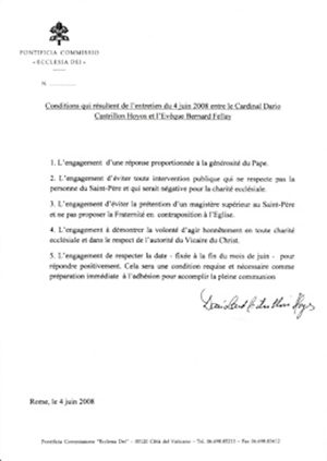 3. L’engagement d’éviter la prétention d’un magistère supérieur au Saint-Père et ne pas proposer la Fraternité en contraposition à I’Eglise.
