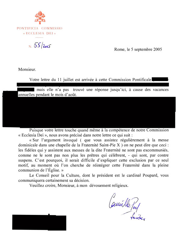 votre lettre du 11 juillet [NDLR : 2005] est arrivée à cette Commission Pontificale […], mais elle n’a pas trouvé une réponse jusqu’ici, à cause des vacances annuelles pendant le mois d’août.