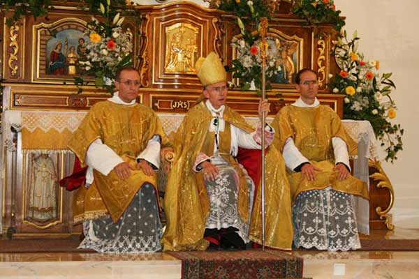 Une petite dizaine d’ecclésiastiques entoure Monseigneur pour son jubilé : M. l’abbé de Cacqueray, supérieur du district de France de la Fraternité Saint-Pie X ; M. l’abbé Radier doyen et directeur de l’Etoile du Matin avec ses confrères MM. les abbés Turpault et de Pluvié ; M. l’abbé Knittel du Prieuré de Strasbourg (Urmatt) accompagné de M. l’abbé Bal Pétré ; et les deux prêtres du Prieuré de Mulhouse MM. les abbés Romanens et Lebourg. Une délégation des Mères dominicaines du Mullerhof est aussi présente.
