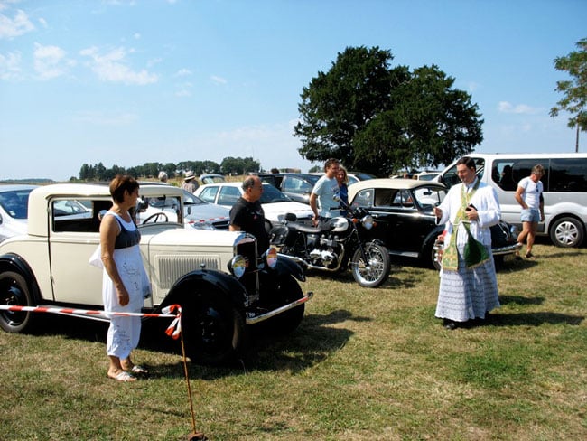 12 H 15 : Après la messe, Monsieur l’abbé procéda à la bénédiction des voitures, une par une, celles-ci ayant été soigneusement rangées pour permettre cette bénédiction bien ordonnée. Les quelques voitures de collection attiraient tous les regards et leurs occupants se dirent très heureux de la ferveur de la messe et de l’atmosphère chaleureuse qui suivit.
