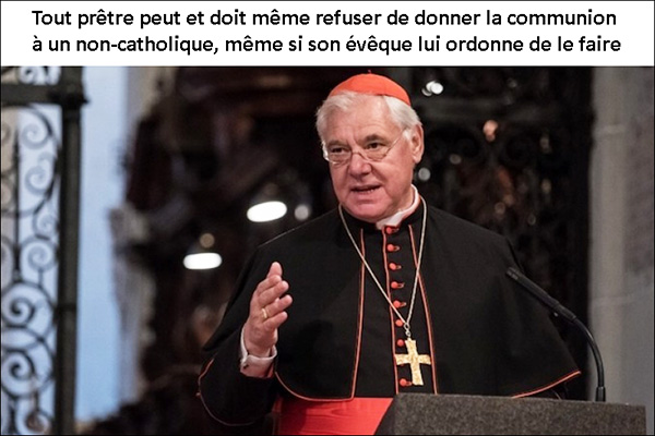 « Tout prêtre peut et doit même refuser de donner la communion à un non-catholique, même si son évêque lui ordonne de le faire », a déclaré le cardinal Gerhard Müller, le 11 décembre 2018, dans un entretien accordé au site d’informations LifeSite.