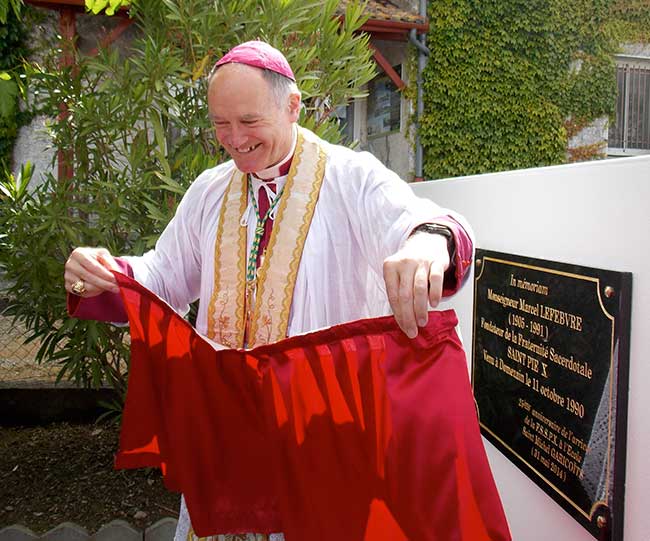 Mgr Bernard Fellay, Supérieur Général de la FSSPX, dévoile la plaque com­mé­mo­ra­tive des 25 ans de l’école