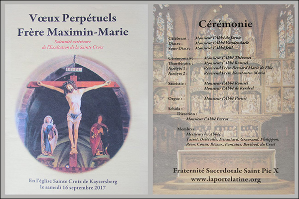 Kaysersberg, le 16 septembre 2017 : c’est dans l’église paroissiale du XIIIe siècle de ce charmant village viticole alsacien que le Frère Maximin-Marie Jaegle s’est engagé définitivement dans la Fraternité Sacerdotale Saint-Pie X