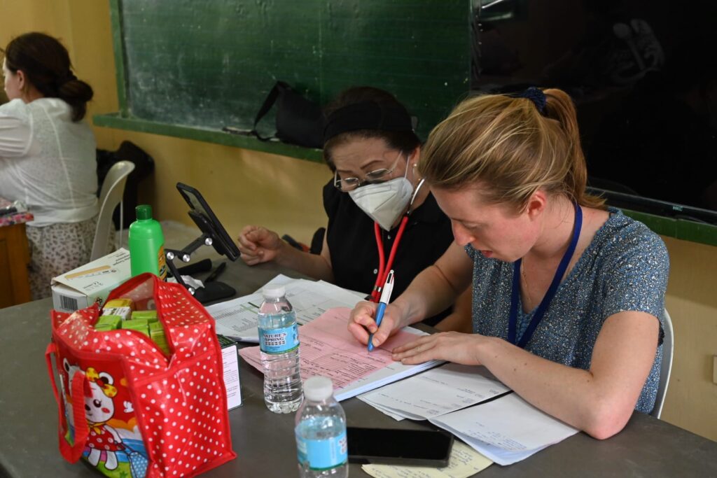 Pour la première fois, Christine, pharmacienne française, est venue épauler Brigitte, fidèle de la première mission, qui assumait souvent seule et depuis le début le fastidieux mais indispensable contrôle des médicaments dispensés. Christine témoigne : « Depuis plusieurs années, avec mon mari, nous souhaitions nous investir dans une association humanitaire, en accord avec notre foi. Le choix s’est porté naturellement sur Rosa Mystica. Mission de la semaine : contrôler des centaines de prescriptions ! Rien de bien sorcier pour un pharmacien — mais plus sportif sans ordinateur et sans Vidal ! Résultat : des journées bien chargées, mais surtout de très belles rencontres, de magnifiques souvenirs et l’envie de revenir. Merci aux Philippins pour leur accueil et leurs visages rayonnants. Merci surtout aux prêtres pour leur travail d’apostolat si important : l’aide matérielle n’est rien sans l’aide spirituelle. »