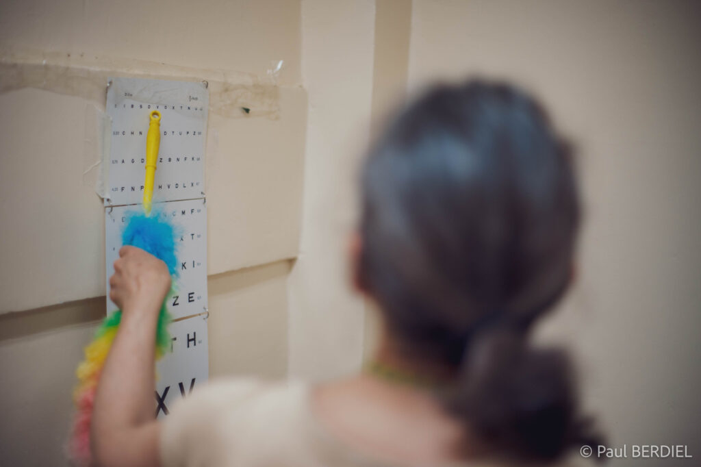 L’école élémentaire de ce village blaan accueille la mission le troisième jour. Cent quatre-vingt enfants de la maternelle à la sixième y descendent quotidiennement des montagnes environnantes — une heure de marche le matin, une heure le soir. La plupart ne parlent que leur dialecte local en entrant à l’école ; ils y apprennent le visaya, langue régionale, et le tagalog, langue nationale. Dans ces contrées, les patients adultes analphabètes, ne parlant que leur dialecte, rendent la communication difficile et cela induit la multiplication des interprètes. « Les examens d’optique se transforment en décryptage de hiéroglyphes ! », sourit l’équipe.