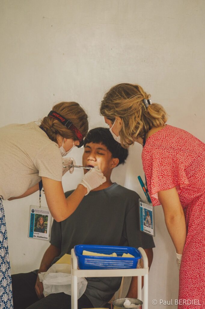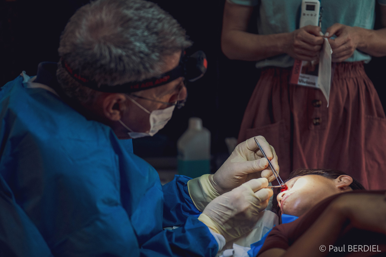 Un « bloc opératoire » : la formule est généreuse pour désigner la petite pièce de quelques mètres carrés de la maternité du village, ordinairement salle d’accouchement, transformée pour l’occasion. Une vieille table obstétricale devient table d’opération ; des bacs en plastique, table d’instrumentation ; des chaises empilées, tabouret surélevé pour le chirurgien. En face, le « cabinet dentaire » est à l’avenant : des patients en file indienne sur des chaises en plastique attendent avec patience — et résignation — leur tour pour l’inévitable avulsion, sous anesthésie locale.