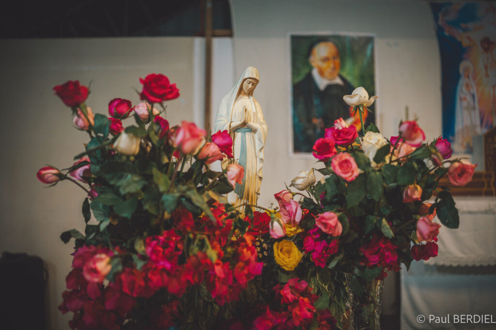 Dès ce premier après-midi, après la cérémonie de bienvenue — chant choral, témoignages de patients qui avaient pu recevoir des soins importants grâce à la mission de l’année précédente, interventions chirurgicales, radiothérapie — tous suivent Notre Dame des Pauvres pour une procession sur la quatre-voies en contrebas de Pinobre Park, notre habituel « quartier général ». Une rose à la main — offertes par ces mêmes patients reconnaissants —, chantant leurs Ave Maria, les volontaires déposent avec émotion leurs fleurs aux pieds de la statue de la Rose Mystique, dont ils s’apprêtent à être les serviteurs fidèles durant ces six jours.