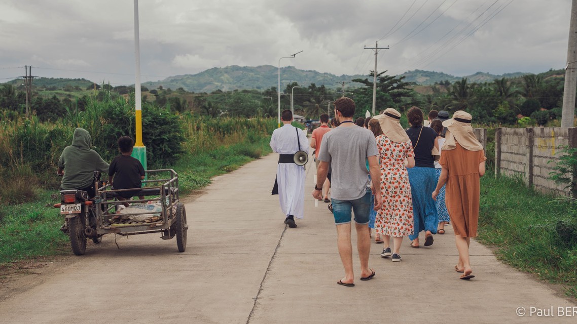 Ce dimanche après-​midi, après la céré­mo­nie de bien­ve­nue, avec chant cho­ral, remer­cie­ments des patients qui ont pu rece­voir des soins majeurs après la mis­sion de l’an der­nier (inter­ven­tions chi­rur­gi­cales, radio­thé­ra­pie, etc.) et pré­sen­ta­tion des volon­taires étran­gers et phi­lip­pins, tous ont sui­vi Notre Dame des Pauvres pour une pro­ces­sion sur la quatre-​voies en contre­bas de notre habi­tuel quar­tier géné­ral de Pinobre Park, à quelques kilo­mètres de General Santos.