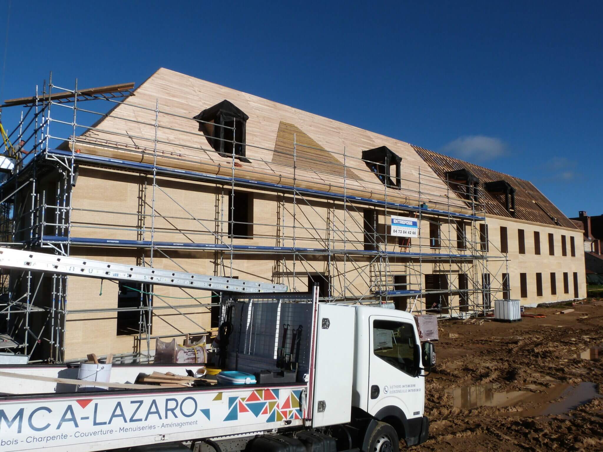 Fin novembre 2022 à mi-février 2023 les charpentiers couvreurs font leur possible malgré la neige et le froid. Détail du façonnage des lucarnes.