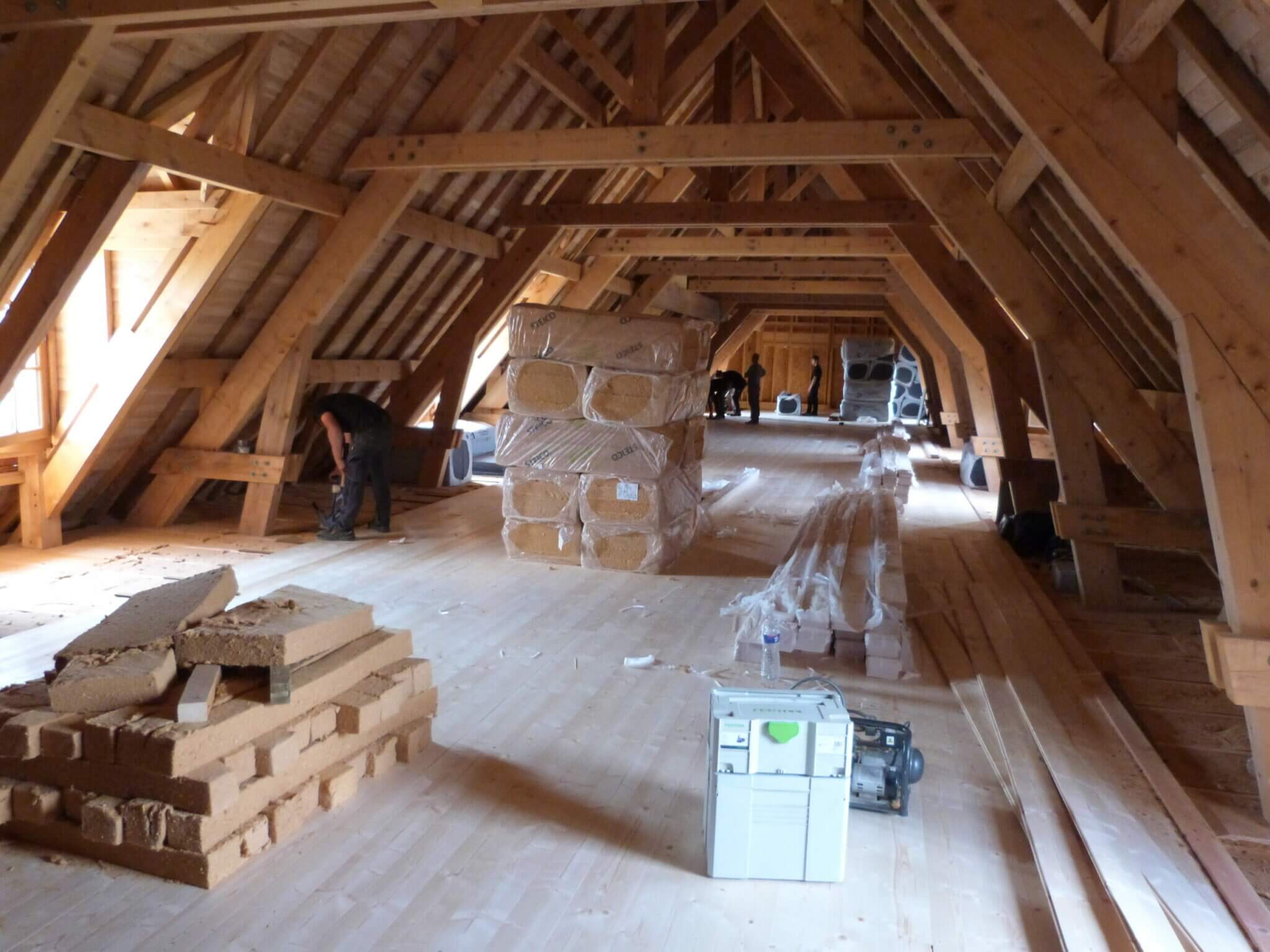 A la fin du mois de juillet 2023 nos menuisiers posent le plancher sapin au grenier en un temps record.