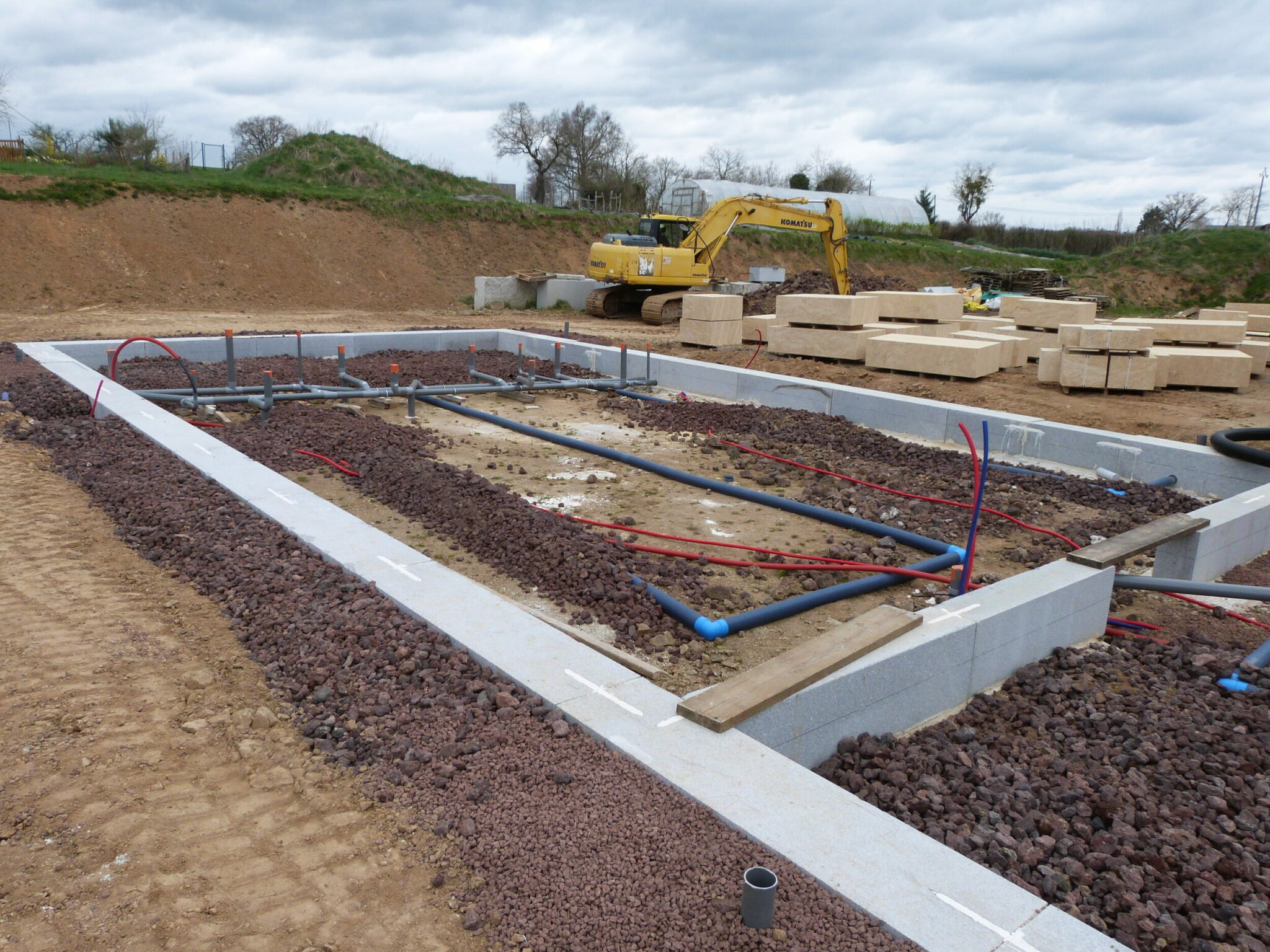 Le terrassier a ensuite préparé les sols ventilés : pose de drains d’air entourés et recouverts de pouzzolane. Pierre volcanique du Puy-de-Dôme, la pouzzolane est le matériau local drainant et assainissant : elle évite les remontées capillaires dans les murs et assure la longévité des bâtiments.