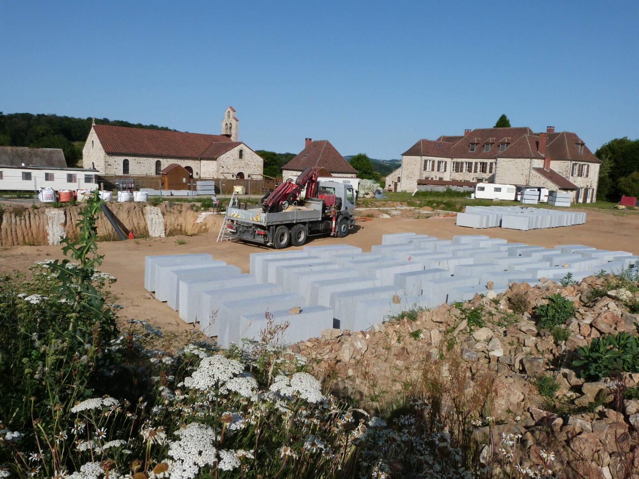 Pendant la pose des blocs de granit, livraison des pierres calcaire de Vers Pont du Gars pour les élévations.