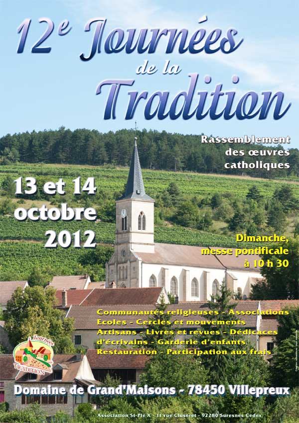 Mises en place il y a plus de douze ans maintenant, les Journées de la Tradition sont désormais bien connues. Le succès qu’elles ont remporté, tout particulièrement en 2010 et 2011, témoigne de leur solide ancrage dans le paysage de la Tradition. Elles réunissent, autour de la Fraternité Sacerdotale Saint-Pie X, des congrégations, associations et divers mouvements ainsi que des professionnels, artisans et commerçants, qui travaillent dans un esprit chrétien à la reconstruction d’une Cité catholique.