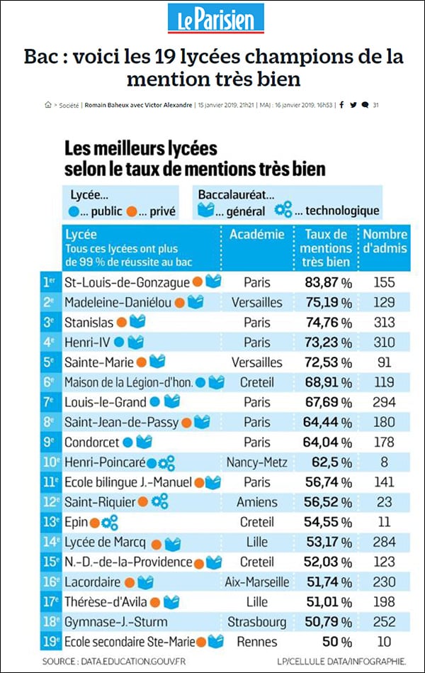 Dans ce classement, établi à parti de données que vient de publier le ministère de l’Éducation nationale, on constate que seuls 19 lycées du pays parviennent à dépasser la barre de 50 % de cette distinction pour la session 2018 du bac général et technologique. Vertigineux quand on sait que la moyenne nationale se situait à 0,8 % d’une classe d’âge en 1990.