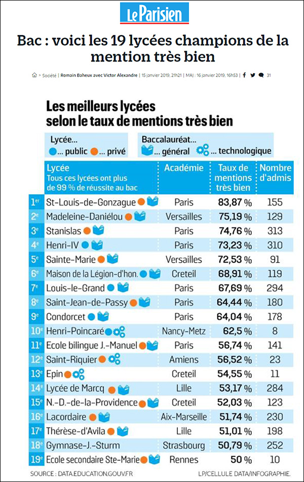 Le taux de réus­site au bac ? Préhistorique, il dépasse les 99 %. Le pour­cen­tage de men­tions ? Dépassé, il oscille entre 90 et 100 %. Aujourd’hui, les meilleurs lycées de ce pays ont encore dépla­cé le cur­seur pour se dépar­ta­ger. La nou­velle bataille de répu­ta­tion de ces éta­blis­se­ments d’ex­cel­lence se joue autour du taux de men­tions très bien au diplôme pas­sé par plus de 753 000 élèves en 2018.