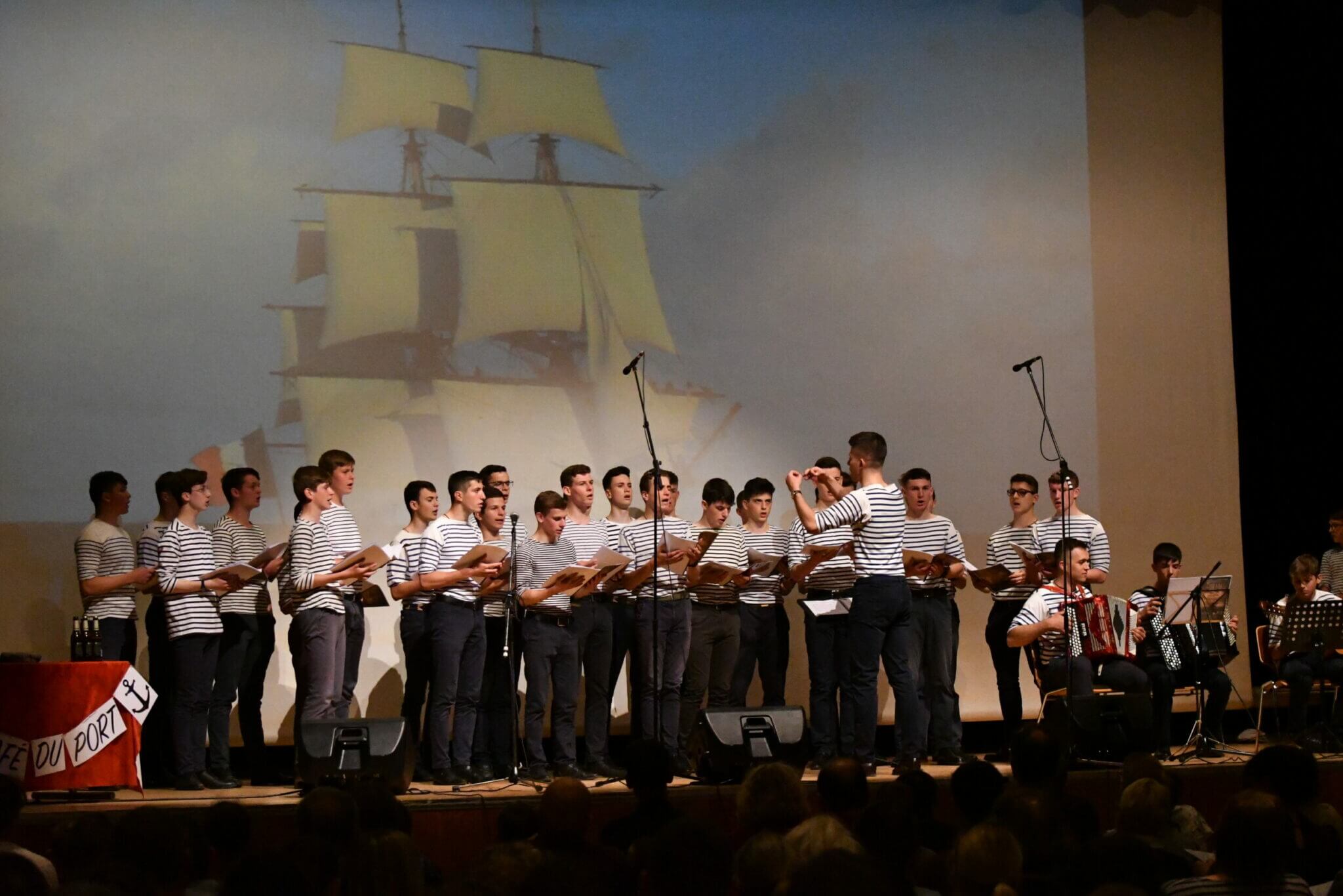 « Chantons la mer ! » : tel était le thème choisi pour l’occasion, avec un répertoire d’une petite vingtaine de chants marins, de quoi dépayser les habitants du Pays de Bitche. Ainsi, pour clore une après-midi ensoleillée, les soixante choristes, vêtus de marinières, sont monté sur la scène de l’Espace Cassin où quelques six cents personnes les attendaient impatiemment. Bien accompagnés par leurs musiciens, pour la plupart élèves de l’École de Musique du pays de Bitche, ils ont interprété des grands airs bretons, des chansons à virer et d’autres incontournables irlandais et écossais. Chaque morceau était introduit par de courtes saynètes. L’émotion et la joie ont rapidement gagné l’auditoire, qui ne s’est pas privé d’accompagner et d’encourager les jeunes chanteurs au fil de ce récital long d’une heure et demie.