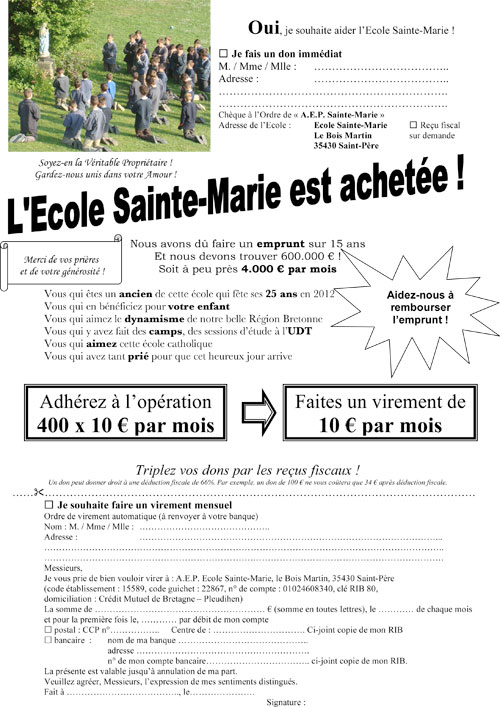 Pour tout renseignement Ecole Sainte-Marie Le Bois-Martin 35430 Saint-Père Marc en Poulet02 99 58 89 07www.ecolesaintemarie.fr Pour tout savoir sur les écoles de la Tradition Les écoles de la Tr...