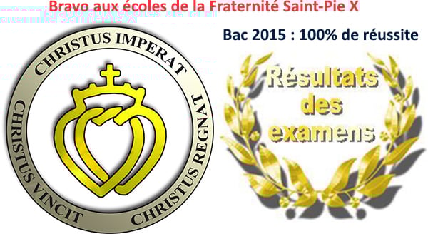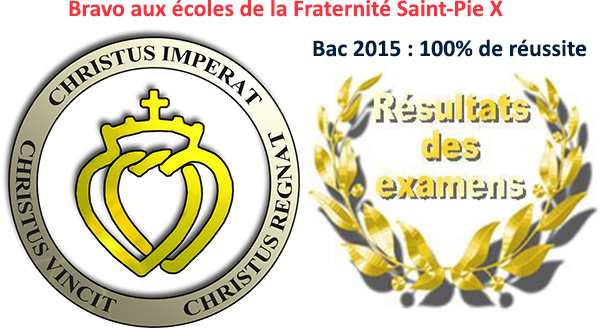 Résultats au baccalauréat 2015 – Ecoles de la Fraternité Sacerdotale Saint-Pie X 100.00 % de réussite – 10 mentions Très Bien – 44 mentions Bien – 34 mentions Assez Bien Pour aider les écoles de la Tradition : faites un don en ligne |