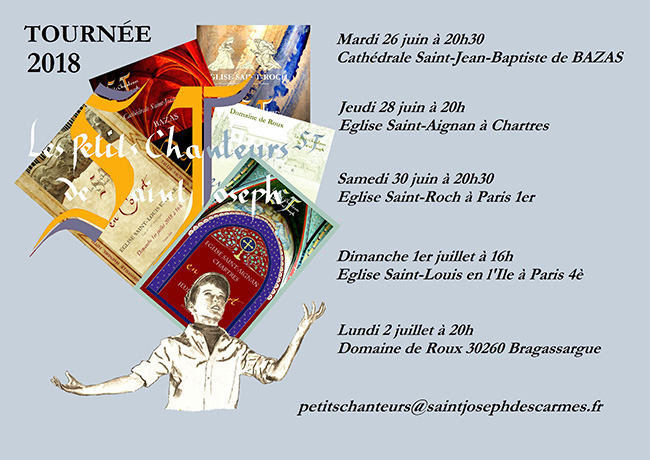 Les Petits Chanteurs de Saint-Joseph se produiront lors de concerts de musique sacrée dans une grande tournée à travers toute la France du 26 juin au 2 juillet 2018 :