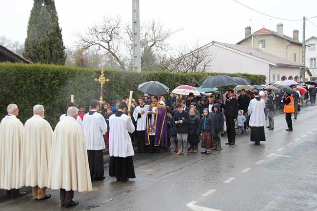 C’est un magnifique chemin de croix qui a eu lieu dans les rues de Villars-les-Dombes en ce Vendredi Saint 2016 sous la pluie, avec environ 150 fidèles dont une quarantaine de la paroisse elle-même.