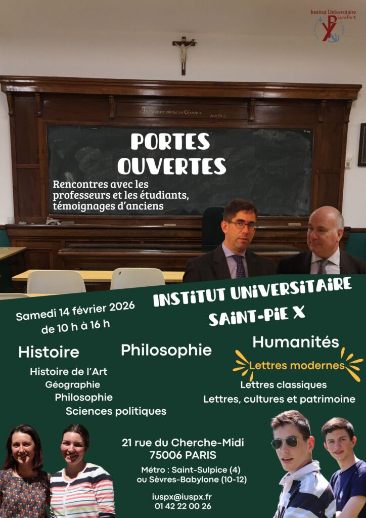 Le samedi 14 février, de 10h00 à 16h00, l’Institut universitaire saint Pie‑X ouvre ses portes. Venez nombreux découvrir les formations variées et complètes proposées aux futurs étudiants !