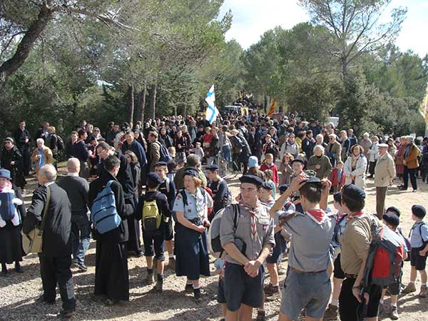 Apres un pique-nique tiré du sac et une paella pour Monseigneur et les abbés, tous avaient rendez-vous en début d’après-midi devant la chapelle Saint Bernard pour la récitation des mystères joyeux du rosaire. Un saint préalable avant d’entreprendre une marche de quelques kilomètres dans la garrigue qui devait les conduire sur les lieux de l’apparition de Saint-Joseph survenue le 7 juin 1660 sur le Mont Bessillon.