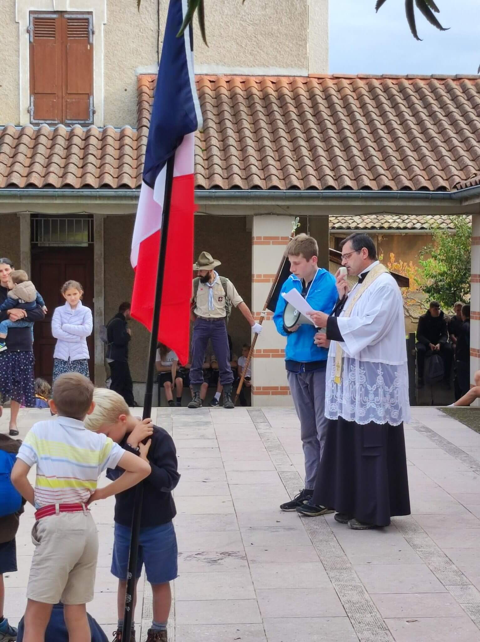 La halte du déjeuner se fit à Sainte-Olive. Plusieurs pèlerins nous rejoignirent pour les derniers kilomètres. Nous arrivâmes à Ars vers 16h30. Le Recteur nous avait accordé la permission de finir notre pèlerinage dans la basilique par un temps de prière mais en nous interdisant la moindre « prédication même petite à l’intérieur de la Basilique ». Nous nous rassemblâmes donc sur les gradins qui accueillent les pèlerins à l’extérieur devant le magasin du sanctuaire. Un prêtre de l’école y commença sa prédication devant environ 120 de nos fidèles, dont de nombreux enfants. Il cita les propos récents de Mgr Schneider sur la Fraternité Sacerdotale Saint Pie X, propos manifestant que nous sommes parfaitement catholiques.