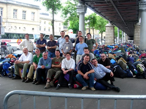 Mgr Fellay, devant un camion de la logistique, et l’équipe liturgie au grand
