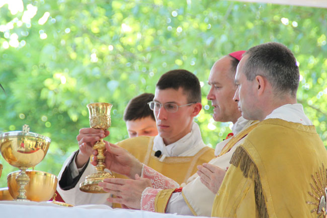 Au loin, les pèle­rins aper­çoivent le velum abri­tant l’autel. Déjà les accents de l’armonium dif­fusent dans les micros les refrains de notre pro­cla­ma­tion de foi : « Je suis chré­tien, voi­là ma gloire, mon espé­rance et mon sou­tien ». A l’horizon, pen­dant que la pro­ces­sion s’ébranle, la mitre et la crosse de l’évêque se détachent pour signa­ler la pré­sence mou­vante du pon­tife bénis­sant la foule des 6500 fidèles.
