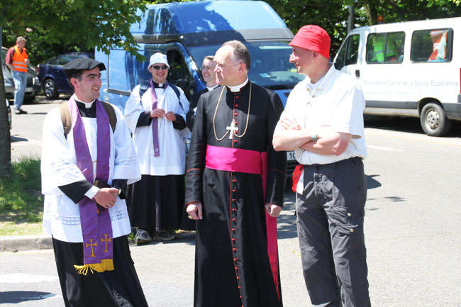 Mgr Bernard Fellay a tenu à saluer les plus jeunes de nos pèlerins qui repartent pour ce deuxième jour de marche le cœur haut et l’âme légère.