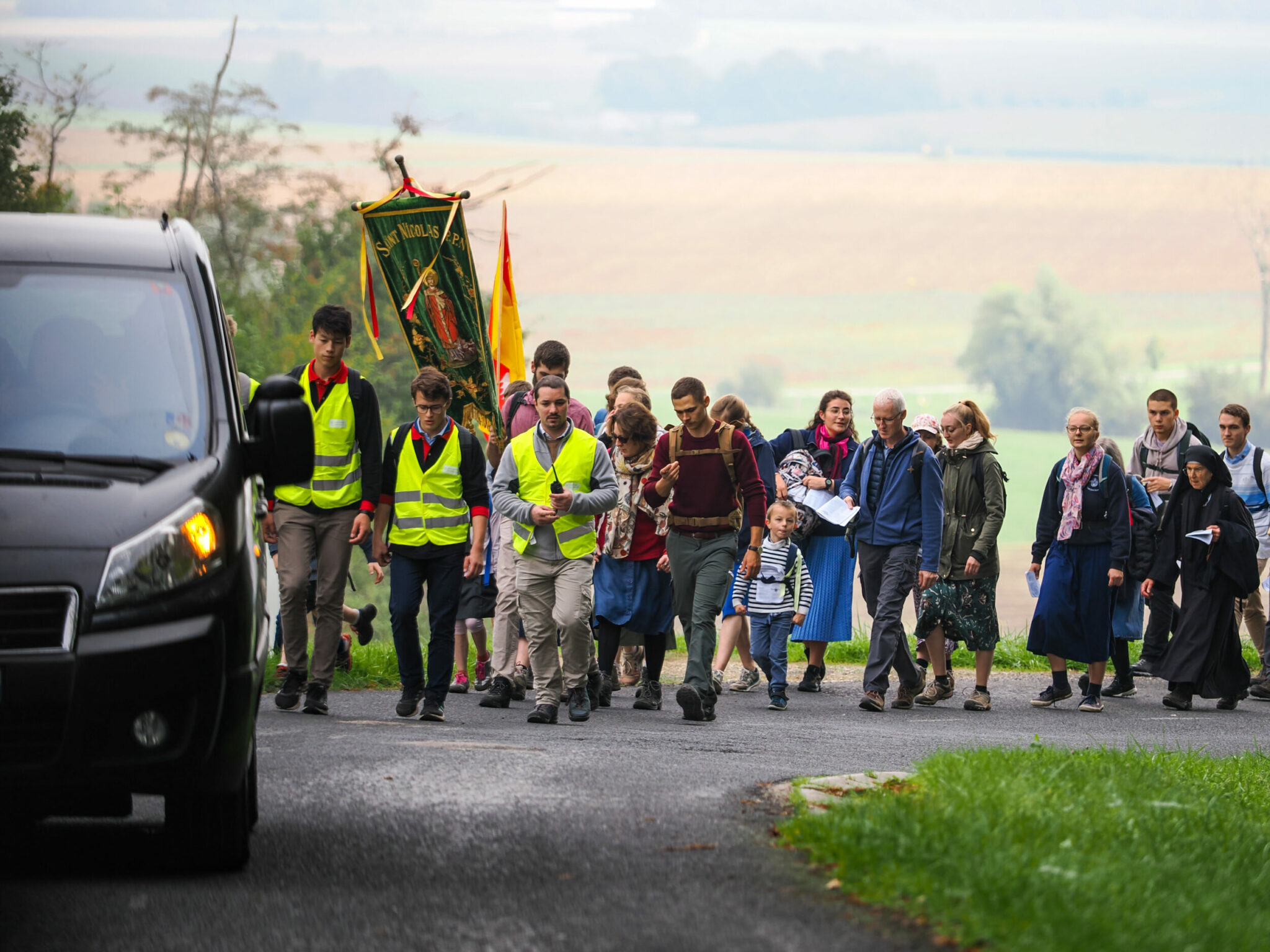 Après avoir dû prévenir tous les pèlerins de changements d’horaires et d’itinéraire à la dernière minute, le pèlerinage débuta cependant sereinement à 10h00 de l’église d’Haraucourt. Gardant le patronage de sainte Jehanne d’Arc, le pèlerinage y adjoignit saint Nicolas.