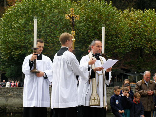 Notre-Dame de Lourdes, nous Vous confions la Fraternité Sacerdotale Saint-Pie X ainsi que toutes les chères communautés amies qui mènent le combat de la Foi avec elle. Nous Vous confions nos séminaires, nos prieurés, nos écoles, nos familles et tous nos fidèles. Nous Vous remercions mille fois de toutes les vocations que Vous déposerez dans le cœur des jeunes gens, des jeunes filles, pour qu’avec une grande générosité ils viennent renforcer nos rangs pour l’évangélisation du monde entier. Monseigneur, pressé pour la deuxième fois de prier le Rosaire, nous sommes convaincus que cette prière généreuse nous procurera bien plus que ce que nous avons demandé. Il obtiendra son infaillible but de plonger les hommes, et d’une façon inouïe, au cœur des mystères de la vie de Notre Seigneur Jésus-Christ, de les faire boire à Ses divines vertus, de leur communiquer son esprit de lumière et de feu, fournaise qui éclaire et qui enflamme.