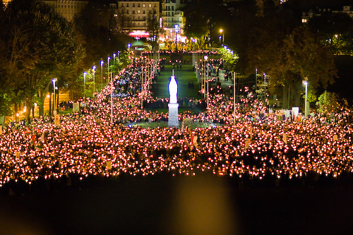 Le clergé, les religieux et les religieuses montent les marches menant au parvis de la basilique du Rosaire où s’achève la procession.
