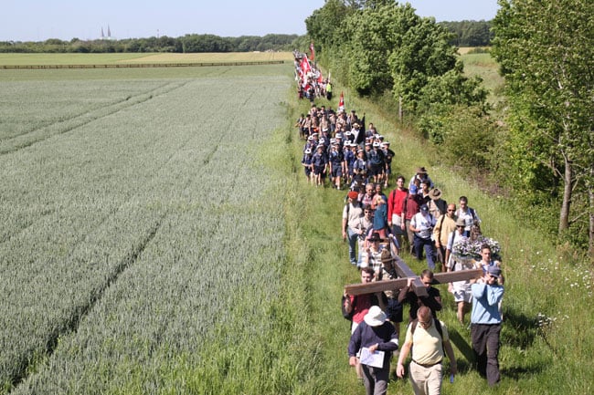 En tête, s’élance pour la vingtième fois la grande croix de bois, témoin pesant mais salvateur de notre union de souffrances à celles du Christ.