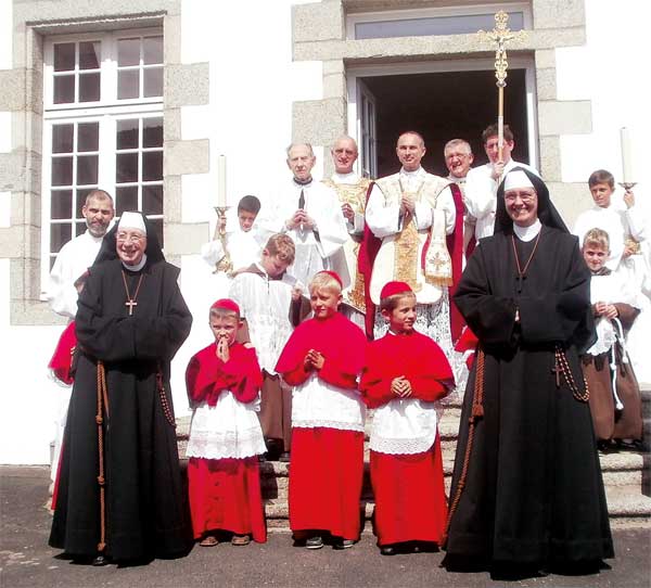 À 10 h 30, l’abbé Régis de Cacqueray, supérieur du district de France, chante la messe votive solennelle du Cœur Immaculé de Marie. L’abbé Philippe François, nouvel aumônier du monastère, fait fonction de diacre, tandis que l’abbé Roland de Mérode, ancien aumônier en partance pour le prieuré de Lourdes, est sous-diacre. Dans le sanctuaire, l’abbé Ruchot, au monastère depuis de longues années, est présent et, parmi les soutanelles rouges, on remarque deux petites bures capucines sous les cottas…