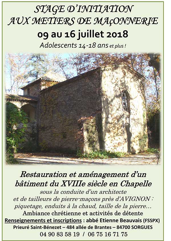 Ambiance chré­tienne et acti­vi­tés de détente Renseignements et ins­crip­tions : abbé Etienne Beauvais, prêtre de la Fraternité Sacerdotale Saint-​Pie X, col­la­bo­ra­teur au prieu­ré Saint-​Bénezet de Sorgues :
