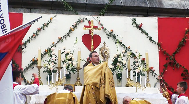 En cette troisième année du relèvement du Grand Sacre par la Tradition, M. l’abbé Emeric BAUDOT, Second Assistant du S upérieur du District de France de la Fraternité Sacerdotale Saint-Pie X, a eu l’honneur de porter le Saint Sacrement devant un grand concours de fidèles.