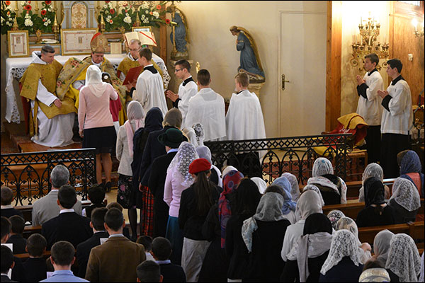 C’est Monseigneur de Galarreta qui nous honorait de sa présence, cette année, pour la cérémonie des Confirmations. Il a pu donner le Saint-Esprit à 55 confirmands, 25 hommes et 30 femmes, au cours d’une belle cérémonie qui précédait la messe du Bon Pasteur, à laquelle assistaient environ 350 fidèles.