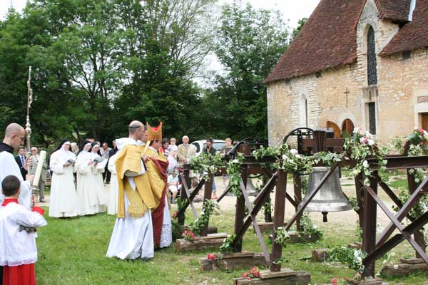 Mgr de Galarreta a béni les cloches de la chapelle Notre-Dame de l’Espérance à Couloutre en présence de MM. les abbés Claude Boivin, 1er Assistant du District de France, et Fleury, curé de Marzy, du R.P. Placide, prieur de Bellaigue, des abbés Nicolas Pinaud, prieur de Couloutre, Alain Delagneau, prieur du Pointet, Bruno Schaeffer, collaborateur à St-Nicolas-du-Chardonnet, Vincent Bétin, directeur de l’école St-Michel de Châteauroux, et Renaud de Sainte-Marie, collaborateur du prieuré de Dijon.