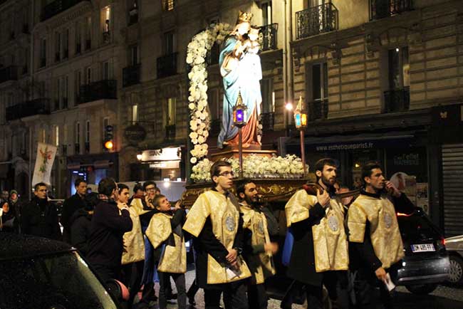 La procession a alterné chants et récitation du chapelet. Arrivé sur la place Monge, M. l’abbé de La Rocque a rendu un vibrant hommage à la Très Sainte Vierge.