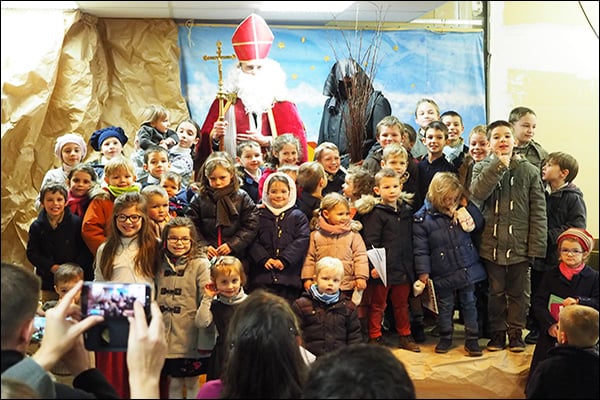 Les enfants de l’é­cole Sainte-​Philomène avec saint Nicolas et der­rière lui…le Père Fouettard…