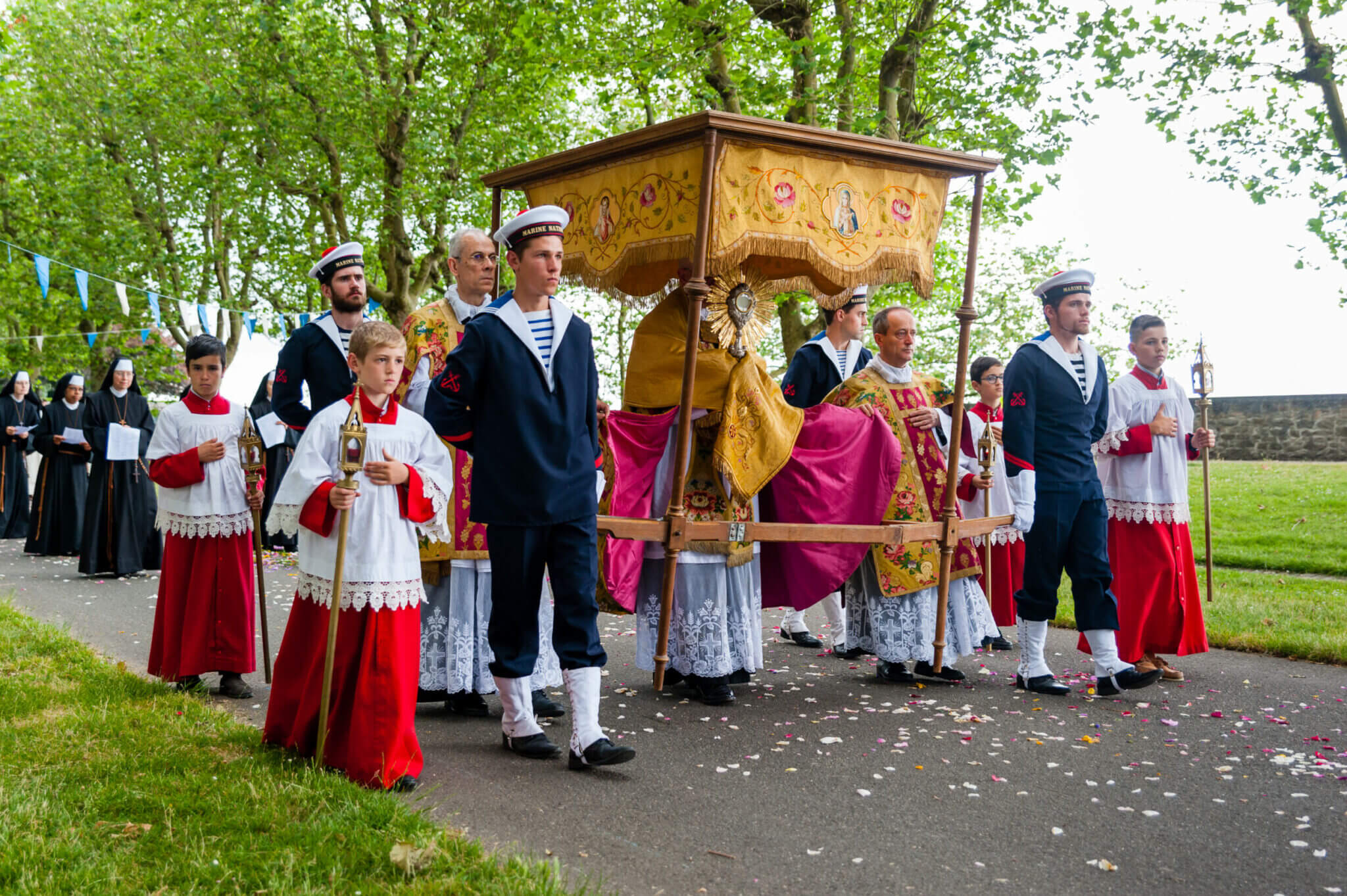 Chaque année depuis 1988, sauf intempérie, une procession est organisée par la Fraternité Saint-Pie X le dimanche de la Fête-Dieu sur le Cours Dajot de Brest. Cette année, cet événement a revêtu une importance particulière en raison de la venue de Mgr Lefebvre comme supérieur général de la Fraternité, le 15 juin 1973. Pour les cinquante ans de cet événement, M. l’abbé de Jorna, Supérieur du district, nous a fait l’honneur de présider la cérémonie. Afin de lui donner la solennité qu’elle mérite, M. l’abbé Aldalur, vicaire au prieuré Saint-Yves depuis août 2022, s’est fait un plaisir d’impliquer le maximum de fidèles pour porter les croix, les bannières, les statues, le dais, pour lancer les fleurs au son de la bombarde, du biniou, de la grosse caisse et des caisses claires. M. l’abbé Vaillant et le Frère Michel de l’école Sainte-Marie sont venus renforcer le clergé. Les religieuses dominicaines de l’école Stella Maris, une délégation des Sœurs de Kernabat, les Franciscaines du monastère Notre-Dame des Fontaines ainsi que Sœur Marie-Jean manifestaient à leur tour l’importance de l’habit religieux et montraient aux passants l’existence de différents ordres religieux traditionnels dans notre région.